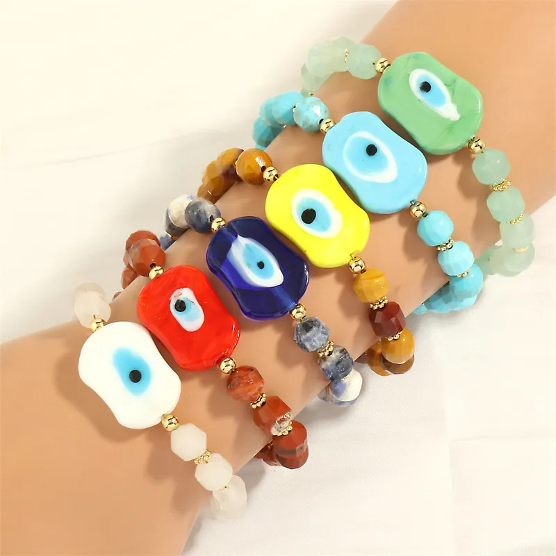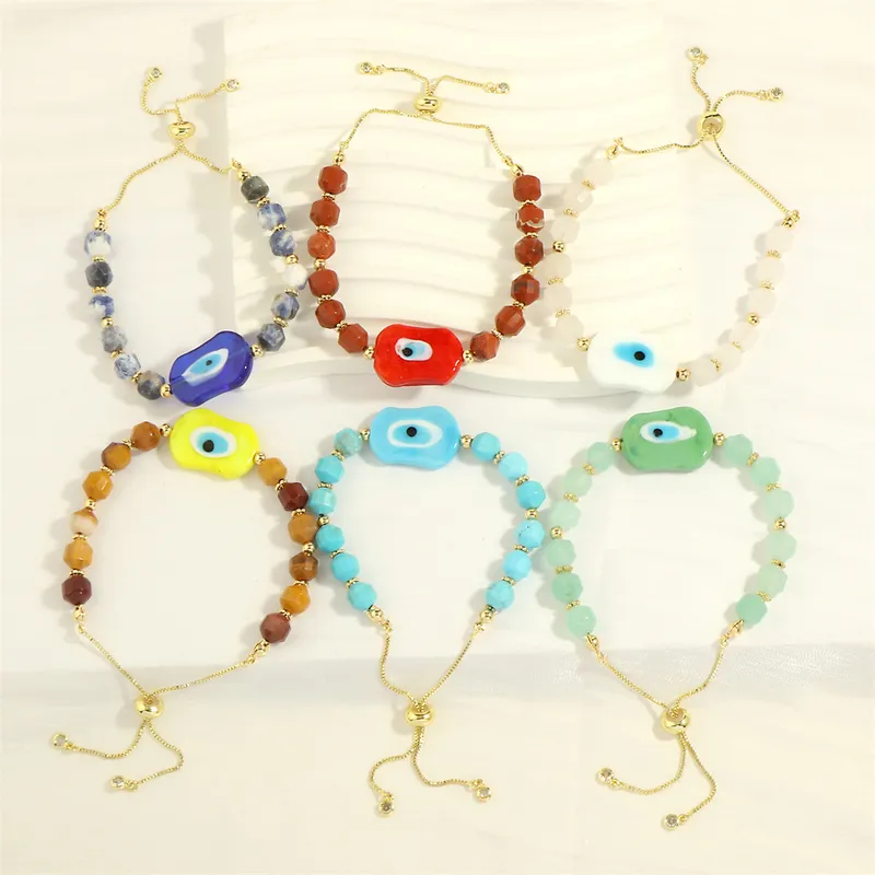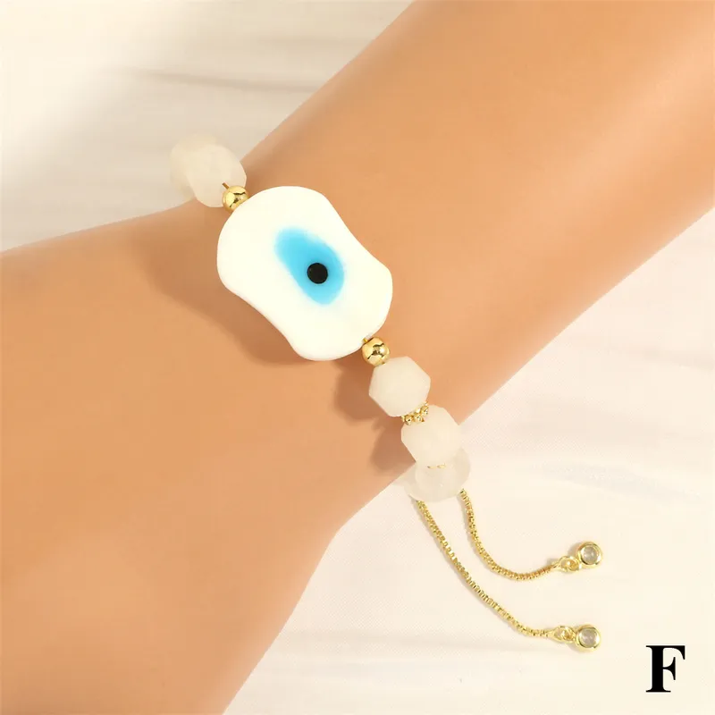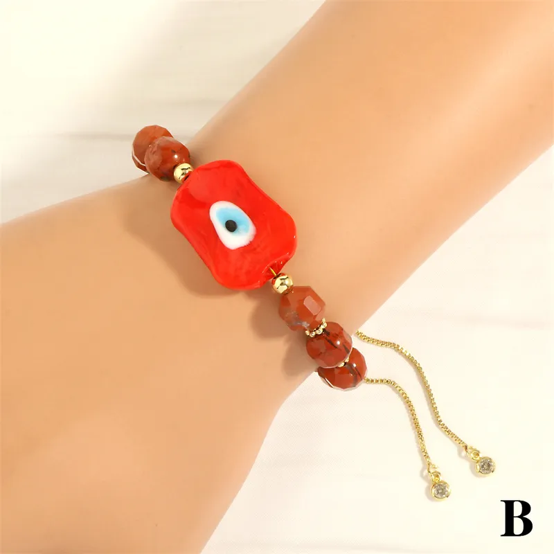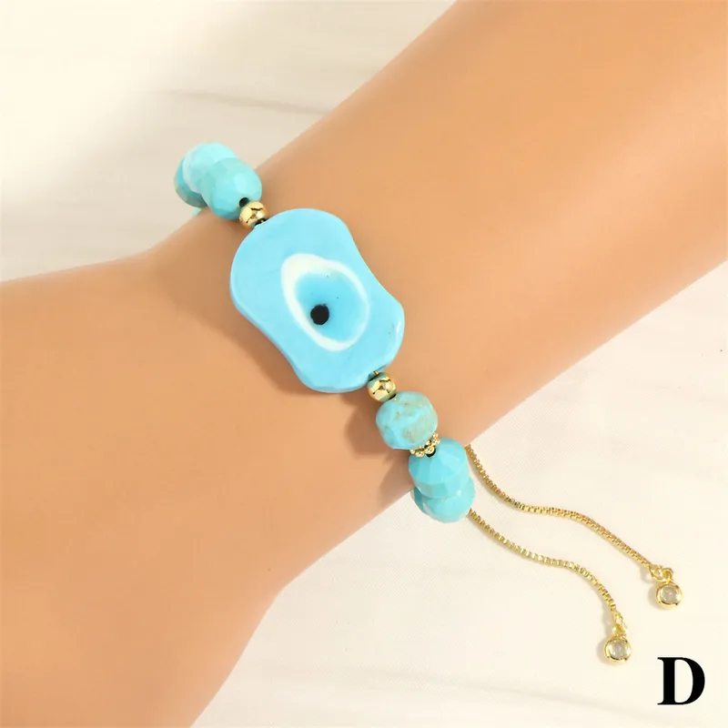 This bracelet is crafted with an acrylic evil eye charm and resin beads, combined with alloy metal elements. The adjustable chain is plated with gold, offering a comfortable fit while keeping the design lightweight and budget-friendly. Perfect for adding a touch of protective symbolism to any look.