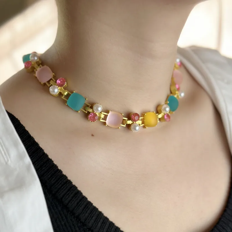 This vibrant and stylish choker necklace is a perfect accessory for those who love bold and playful designs. Featuring a combination of colorful square and round resin stones in pastel tones of pink, teal, and yellow, it adds a cheerful and elegant touch to any outfit.