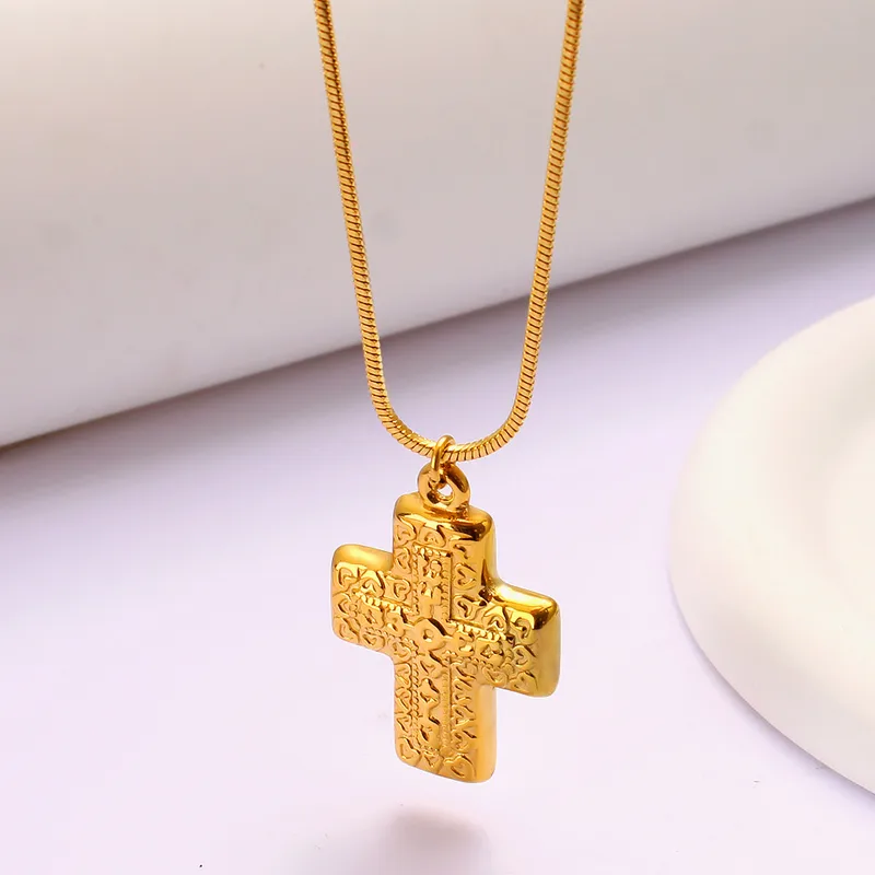This beautifully crafted necklace features a gold-tone cross pendant, designed to add a touch of elegance and sophistication to your outfit. The intricate floral patterns engraved on the cross highlight its attention to detail and make it a standout accessory for any occasion.
