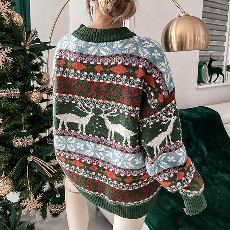 Ugly Christmas Sweater Animal & Snowflake Knit Design Brown & Green